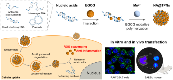 基因治疗是一种通过操纵基因表达来治疗疾病的新型治疗方法。目前,基因治疗领域已经开发出了病毒/非病毒载体用于基因传递,但这些载体存在较高的免疫原性和生物毒性等安全风险。近期,william威廉亚洲的周文虎教授和广东医科大学湛江中心医院的齐妍教授团队合作,在中科院1区TOP期刊 Advanced science (IF=17.521)上发表题为“A General and Efficient Strategy for Gene Delivery Based on Tea Polyphenols Intercalation and Self-polymerization”的研究论文,介绍了一种基于表没食子儿茶素没食子酸酯(EGCG)的茶多酚纳米粒(TPNs)作为基因递送载体的新策略。