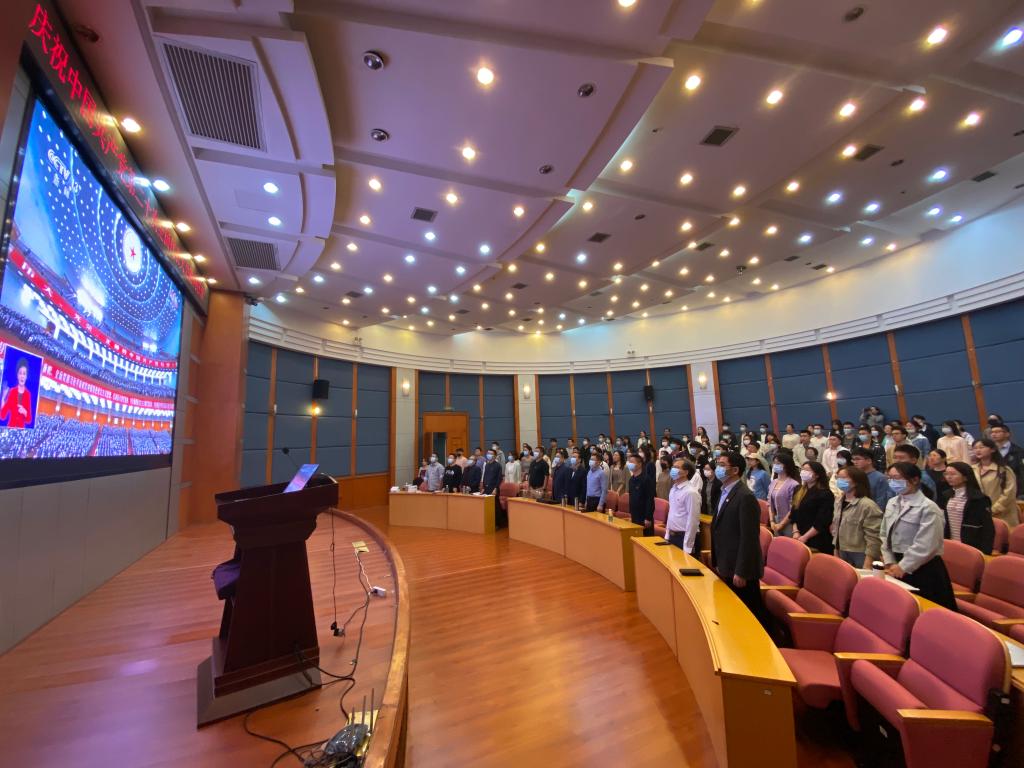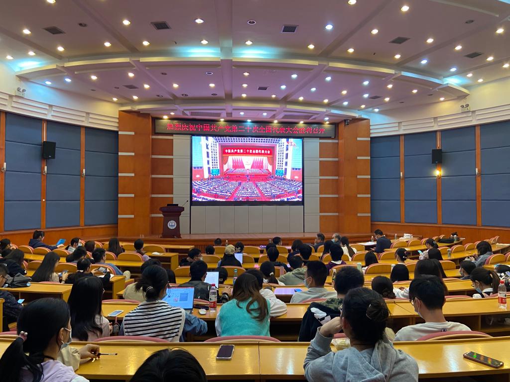 10月16日上午,中国共产党第二十次全国代表大会在北京人民大会堂开幕,习近平总书记代表第十九届中央委员会向大会作报告。william威廉亚洲组织师生党员在福庆楼4楼学术报告厅集中收看党的二十大开幕式实况直播。在观看现场,师生边看边做好记录,不时响起热烈的掌声。观看结束后,师生党员以交流会、撰写心得等形式交流学习体会。