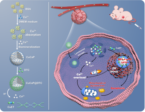 传统解酒药双硫仑(DSF)联合铜离子(Cu2+)在癌症治疗中展现出了一定的潜力。研究表明,DSF在体内的代谢产物二硫卡钠(DTC)会与Cu2+结合形成一种新的化合物 CuET,CuET可干扰p97-NPL4-UFD1通路,并诱导内质网应激从而使胞内Ca2+释放到细胞质中,从而引起Ca2+过载,导致线粒体功能损伤并诱导癌细胞凋亡。另外,我们发现通过引入外源性Ca2+可使胞内Ca2+更快达到起效阈值,进一步增强CuET的细胞毒性。因此,本课题通过制备了含有Cu2+的磷酸钙纳米粒,并在表面吸附DTC。该纳米粒具有酸敏性,可在弱酸性溶酶体环境中降解释放出Ca2+、Cu2+和DTC。Cu2+和DTC在胞内原位生成CuET,其不但能抑制p97-NPL4-UFD1通路诱导癌细胞凋亡,而且与来源于纳米粒的Ca2+协同诱导细胞Ca2+过载。该纳米制剂在体外和体内均具有显著的抗癌功效。