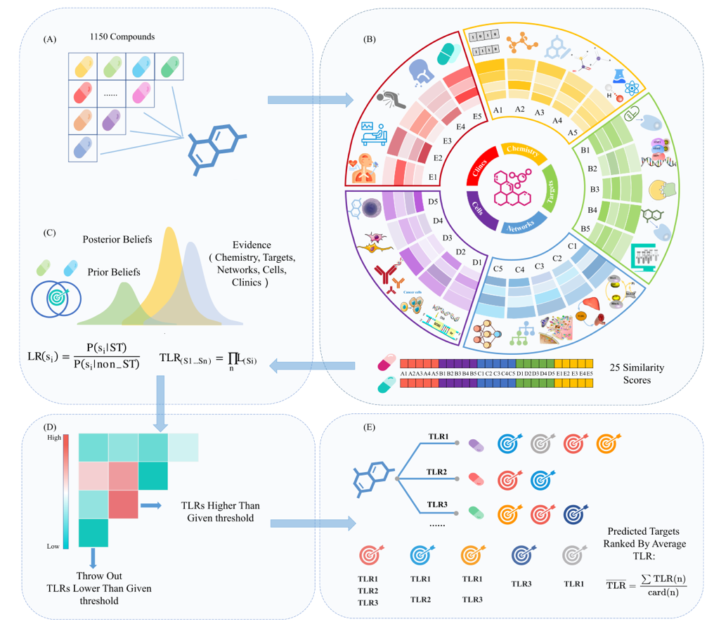 候选分子的靶标识别是药物开发过程中至关重要的一步,涉及先导化合物的发现、药物的再利用以及潜在的脱靶效应或药物副作用的解释。因此,提高靶点预测的精度具有重要意义。目前的靶点预测方法主要依赖基于配体的化学相似性原理,难以捕捉基于配体高水平特征的新化合物-靶点关系。在此背景下,该团队引入了一种创新算法——融合多生物表征策略(FMBS),该方法利用贝叶斯框架整合了跨越药物开发的全过程信息:从小分子(A化学)与其相关蛋白受体(B靶点)之间的相互作用,到被激活的生物通路(C网络)和由此产生的表型变化(D细胞),并延伸到临床层面(E临床)。最后基于骨架跃迁通过投票策略预测新靶点,预测效果显著优于基于化学描述符相似性的方法。同时,该方法可应用于所有分子,其适用性得到提升。此外,与其他复杂的机器学习模型相比,由于贝叶斯框架似然比的可解释性和轻松添加新数据类型的能力,研究人员可以根据专家经验灵活选择想要整合的数据类型。