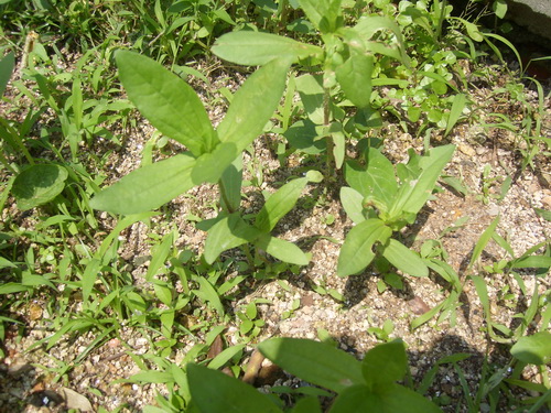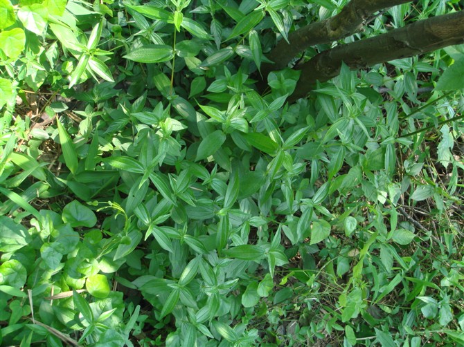 鳢肠Eclipta prostrata L. 又名旱莲草,墨草,菊科鳢肠属。幼苗子叶椭圆形或近圆形,初生叶2个,成株茎从基部和上部分枝,直立,被伏毛,叶对生,无柄或基部叶具柄,全缘或具细锯齿。头状花序顶生或腋生,植株断面有汁液渐变黑。全草入药,有凉血、止血、滋补肝肾、清热解毒之效。