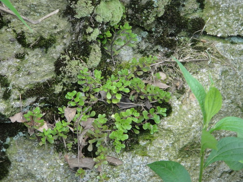 凹叶景天Sedum emarginatum Migo 景天科费菜属,多年生草本,植株细弱,倾斜,着地部分生有不定根。叶对生,匙状倒卵形至宽匙形,顶端凹缺,有时基部渐狭,近无柄,有短距。聚伞花序顶生,常3分枝,花无梗.全草入药,有清热、解毒、利尿、平肝之效,用于治痢疾、疮毒、跌打损伤等症;浙江民间用来治疗肝炎。