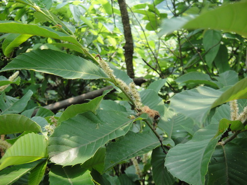 板粟Castanea mollissima Blume 壳斗科栗属。单叶互生,椭圆或长椭圆状,边缘有刺毛状齿。雌雄同株,雄花为直立柔荑花序,雌花单独或数朵生于总苞内。坚果包藏在密生尖刺的总苞内。果实与桃、杏、李、枣并称“五果”。属于健胃补肾、延年益寿的上等果品。