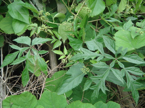 白蔹Ampelopsis japonica 葡萄科蛇葡萄属。块根粗壮,肉质形如鸡鸭卵,三、五枚同窠,皮赤黑,肉白。茎多分枝,幼枝带淡紫色,光滑,有细条纹;卷须与叶对生。掌状复叶互生,微淡紫色,光滑或略具细毛,小叶3-5,羽状分裂或羽状缺刻;块根入药,有清热解毒,散结止痛,生肌敛疮之效,用于疮疡肿毒,瘰疬,烫伤,湿疮,温疟,惊痫,血痢,肠风,痔漏,白带,跌打损伤,外伤出血。