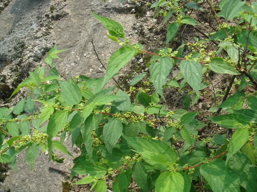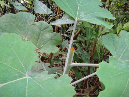 博落回Macleaya cordata (Willd.)R.Br 罂粟科博落回属。多年生大型草本,基部灌木状,具乳黄色浆计。根茎粗大,橙红色。茎绿色或红紫色,中空,上部多分枝,无毛。单叶互生;上面绿色,无毛,下面具易落的细绒毛,多白粉,基出脉通常5,边缘波状或波状牙齿。大型圆锥花序多花。全草入药,有祛风解毒,行气消肿,杀虫之效,用于指疔,脓肿,急性扁桃体炎,中耳炎,滴虫性阴道炎,下肢溃疡,烫伤,顽癣。