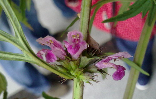 19、唇形科细叶益母草花和萼片的观察:轮伞花序,下有刺状小苞片,花萼筒状钟形,5脉,长尖齿5,前2靠合,花冠内有毛环,上唇外被柔毛。