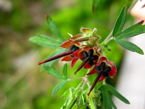 1、牻牛儿苗科野老鹳草的蒴果观察:具糙毛,有长喙,果瓣5,种子黑色。萼片宿存。