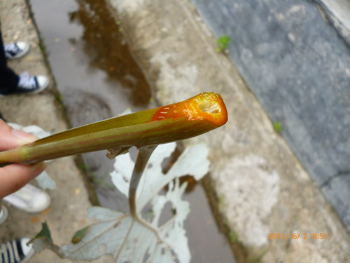 21、罂粟科博落回乳汁的观察:新断面乳汁白色,创面暴露在空气中不到一分钟乳汁就变为桔红色至红棕色,因乳汁内富含血根碱。