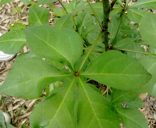 8、五加科刺五加茎叶的观察:茎生倒生小刺,掌状复叶互生,边缘具尖锐重锯齿或锯齿。