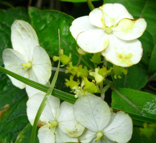 20、虎耳草科中国绣球(Hydrangea chinensis Maxim.)花序和花的观察:聚伞花序,无总花梗.放射花无萼或4~5;孕性花白色,瓣5,离生.花柱3~4,蒴果卵球形,有3~4枚宿存花柱,此也是区别忍冬科蝴蝶荚蒾主要特征之一。