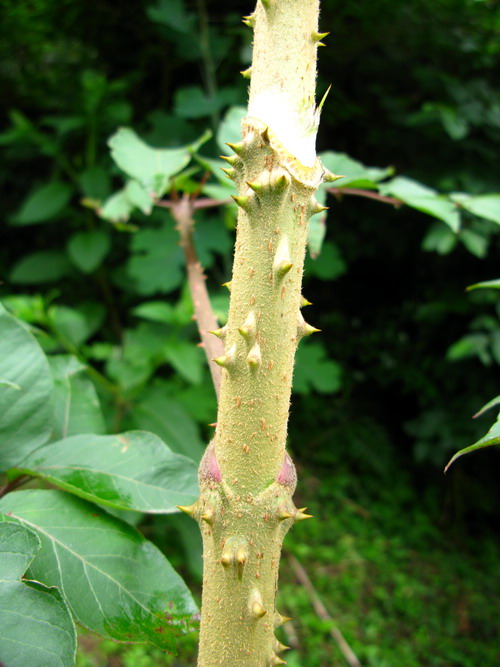 9、五加科楤木茎的观察:树皮灰色,疏生粗壮直刺。托叶与叶柄基部合生,耳廓形。叶轴具细刺。