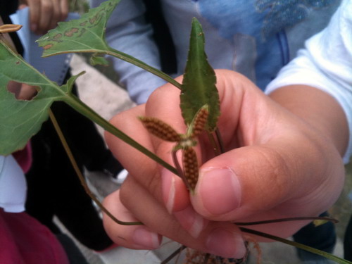 12、大戟科野桐属白背叶花序的观察:小枝,叶柄均被白色密毛。叶互生,先端渐尖,基部宽楔形,圆形穗状花序生枝顶,雄花在上,雌花在下。