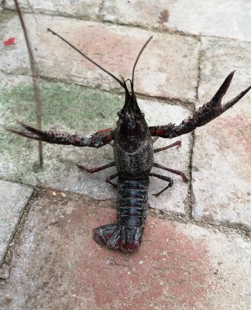 第二天在药棚里小组学习时,一个小身影悄无声息地进入了我们的视线,当时,它就是这样挺着自己的腰杆,举起自己的钳子,在向我们宣示着:别靠近我,小心我夹你,你不怕疼就过来呀!大家都好像听到了它的宣示,谁都不敢靠近,后来看它孤独的身影站在药棚里,太可怜了,就想把它放生在池塘里,但是没有一个人敢去碰它,好吧,我又一次当了男生,慢慢绕到它的后面,轻轻地拿住了它,将它放到了池塘里,回来之后,大家都没想到想我这样的女生身体里竟然住着一个比男生还刚的女生,对我着实佩服。