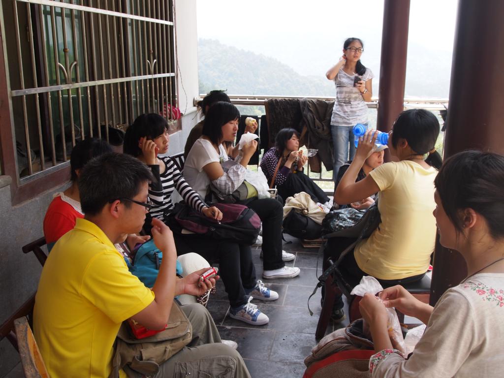这消息对于又饿又累我们来说无疑像冬日里的一把火、夏天里的一阵风。于是我们开始四处张望哪有一片阴凉,哪有一个亭子。终于发现了一个亭子时,却同时不幸的发现它已被另外三组同学们捷足先登了,他们在那里欢快地吃着午餐!抬头望去,我惊奇地发现我们和蔼优雅的李老师竟然很没形象地在亭子下啃面包!