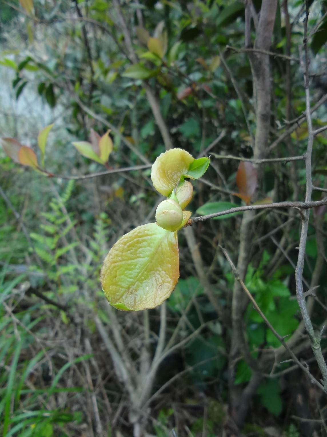 乡间的路不好走,但是植物却比公路旁丰富得多,还看到几棵还没开花的山楂树。路边绿莹莹一片的茶树,都或多或少长着些茶耳。据说,背面表皮脱落,绿色的茶耳最为可口。我尝了几片,果真如此,后来走累了,便吃些茶耳补充补充。途中遇到一小片竹林,大家想去再找些黄精,顺便挖些竹笋。黄精没寻到,竹笋倒是挖了几个,据说他们回宿舍后烫火锅吃了,味道很是不错。大约是九点多上山,这会儿已经接近中午了,阳光逐渐强烈起来,晒得人衣服发热。我们在林子外歇了歇,挖了些开黄花的景天,离开了田垅,跟着老师向山林前进。我们决定从这片林子直接爬到山顶。