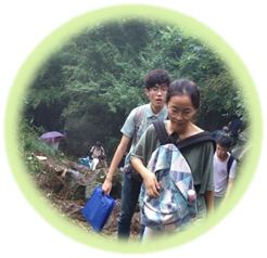 这些各具特色的植物让我们的行程饶有趣味,颇具意义,并将深深地烙印在我的脑海里。但更值得一提的,莫属于第二天向南天门进发了。也不知怎的,一个峰回路转,我们的信念便拧成一股绳,一致决定爬上南天门。通往南天门的路不像寻常走的盘山公路那样平坦宽阔,蜿蜒曲折的道路上布满了大大小小的碎石,前行的台阶忽高忽低,一不留神就有摔倒的危险;道路两旁林草丛生,遮蔽着阳光,使前行的道路充满了阴冷和幽静;细雨蒙蒙,夹杂着却带凉意的风,淅淅沥沥地洒在我们身上,增加了我们攀登的阻力。不一会儿,我们便气喘吁吁,走走停停,虽然李劲平老师几次问“同学们真的要爬上南天门吗?”,但气喘吁吁的我们依然固执地往上攀登,立志登上南天门。越往上,路便越陡,沿途留下的脚印也越发沉重,而天公也不作美,说闹脾气就闹脾气,瓢泼大雨倾盆而下,在我们的雨伞上张牙舞爪的嚣张。我们虽说精疲力竭,但心里那份不服输的倔强与坚持支撑着我们:不退缩,不退缩!也正是这种坚持,让我们挖到了茁壮肥厚的丹参呢!