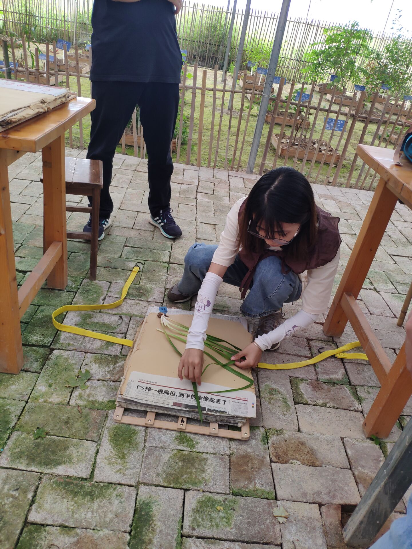 采集完植物后,制作植物标本也是非常有趣的过程,尽量选择完整的植株进行标本压制,要先将泥土清理干净,摘去枯萎、杂乱的枝叶,把植物摆在吸水纸上,最重要的是给它“凹”个美美的造型,像一件艺术品,大家都精心摆弄着自己的标本,大棚里回响着铃铛笑声。