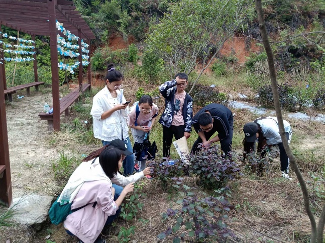 经历了大约三个小时的路程后,我们终于到达了贾岭药博园。当时已近下午两点钟了,饥肠辘辘的我们放下行李之后就去大厅吃了饭,那个饭菜非常合我的口味,我认为比食堂的味道都要好很多。无论是红烧鱼还是那个胡萝卜炒腊肉以及那个冬瓜枸杞汤都非常的好吃。特别是在这种农家的氛围里,吃起来又格外的鲜美,感觉尝到了大自然的味道。在经过短暂的休息之后,我们就来到了贾岭药博园的空地上进行了分组以及领工具,领标本夹等。随后,我们的带教老师——雷鹏老师就把我们带到了贾岭药博园的植物园开始认识生药植物。这是一种很奇妙的体验,从书上的文字变成了现实生活中看得到摸得到的真实的植物,让我倍感亲切。