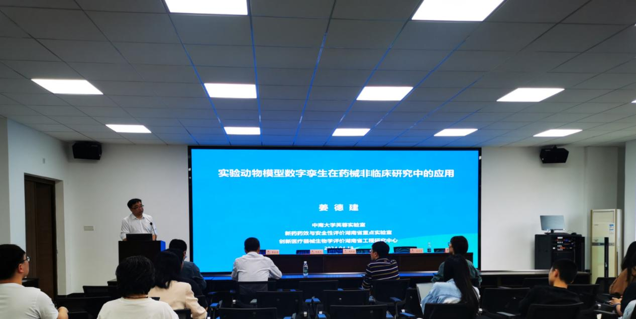 湖南省药物安评中心主任姜德建研究员以“实验动物模型数字孪生在药械非临床评价中的应用”为题做了精彩的学术讲座,为在场师生介绍了专业领域的学术前沿研究,并且对动物实验、动物模型、人工智能及药械非临床评价等方面结合科研实际做了深入的讲解。